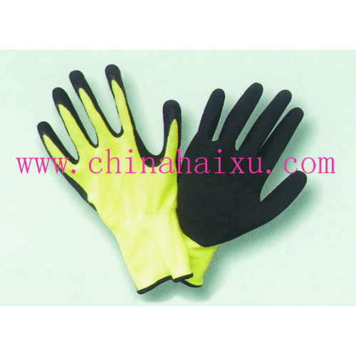 DESCRIPTION: 13-gauge yellow Nylon knit shell, Black natural latex palm and fingertip coated, foam finish